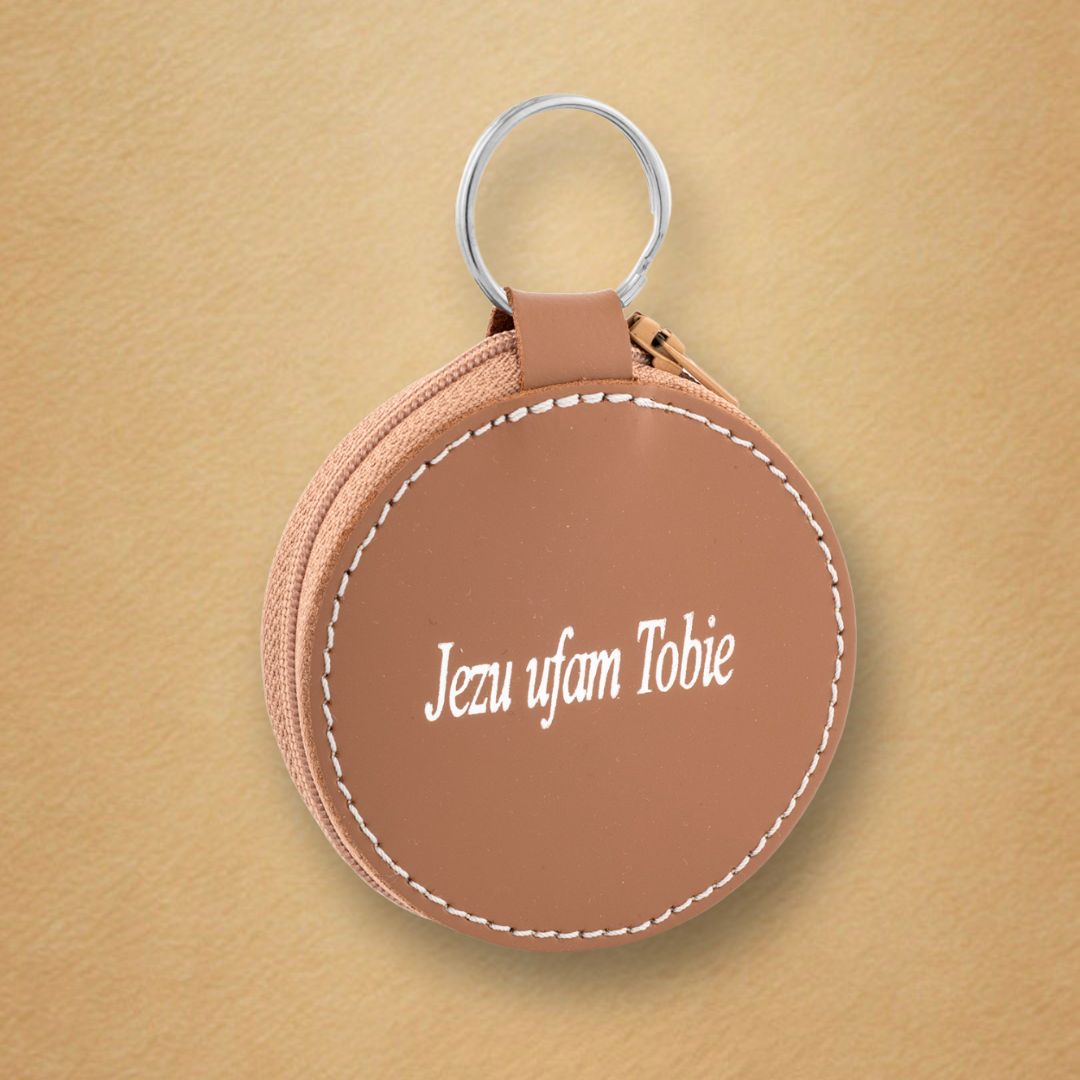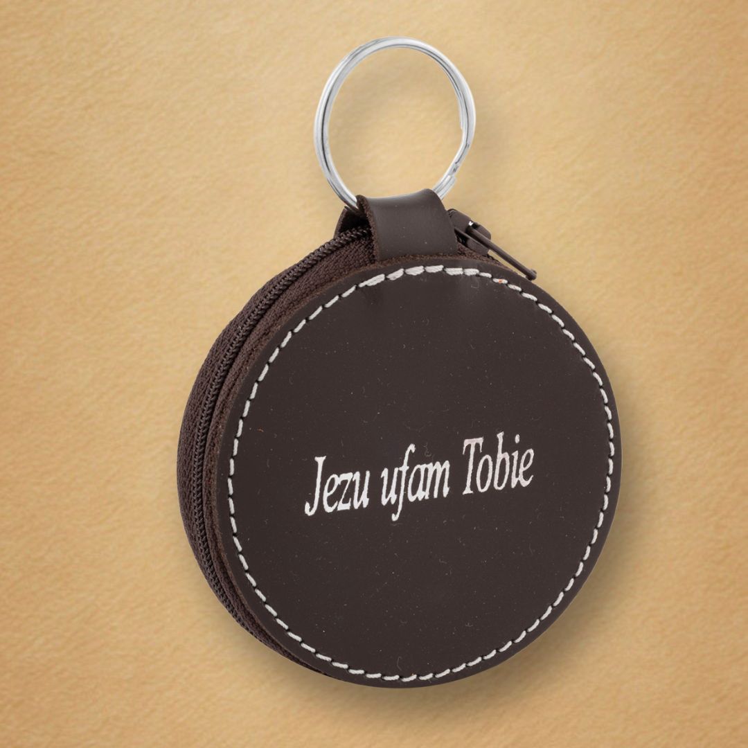 Skórzany brelok z napisem „Jezu Ufam Tobie” – z zamkiem, funkcją pokrowca i świadectwem wiary