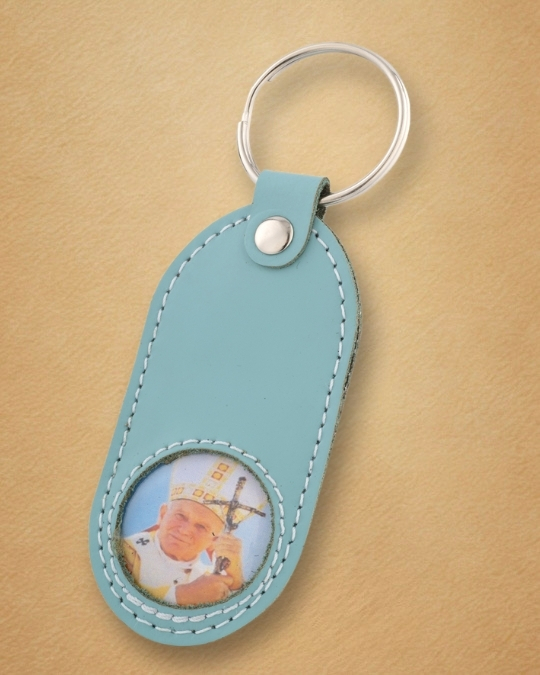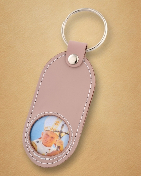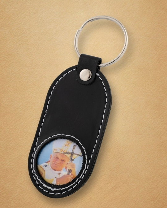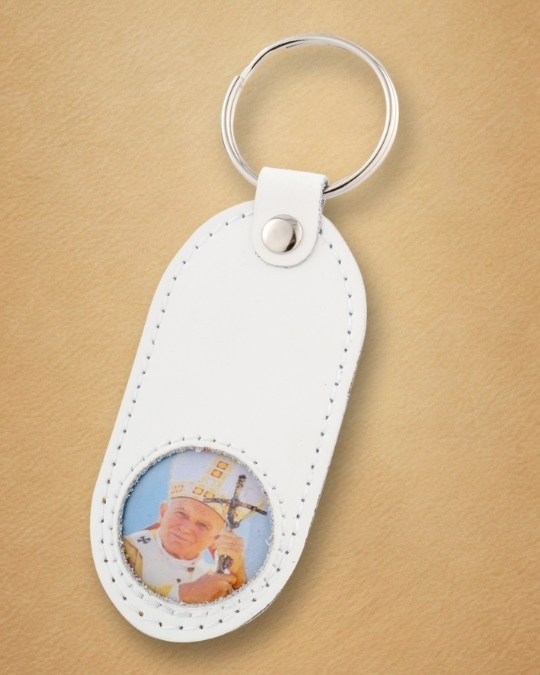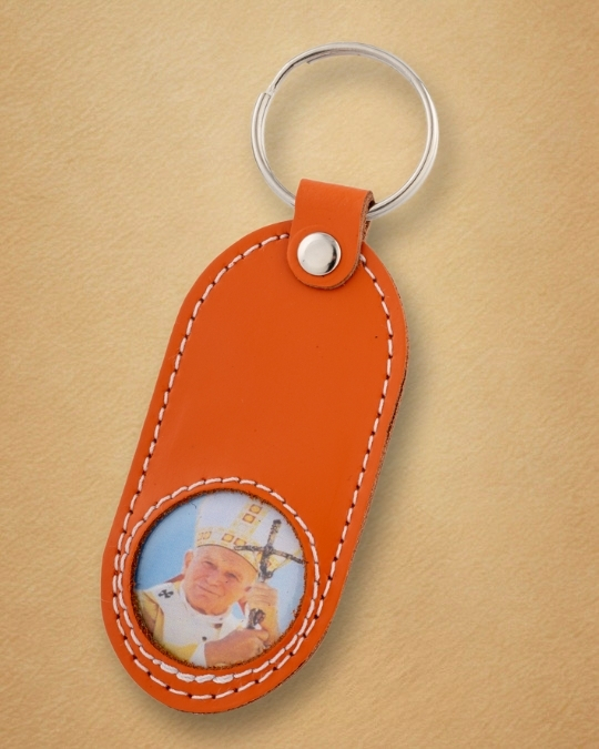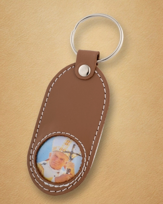 Tłoczony wizerunek Papieża Polaka, wykonany z najwyższą precyzją, sprawia, że brelok staje się osobistą pamiątką – codziennym przypomnieniem o Jego nauczaniu, sile modlitwy i zawierzeniu Maryi.