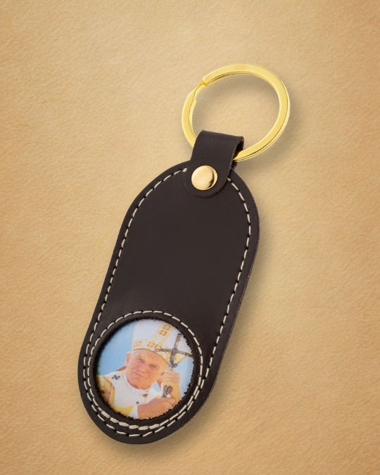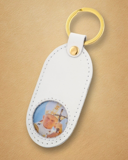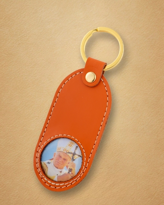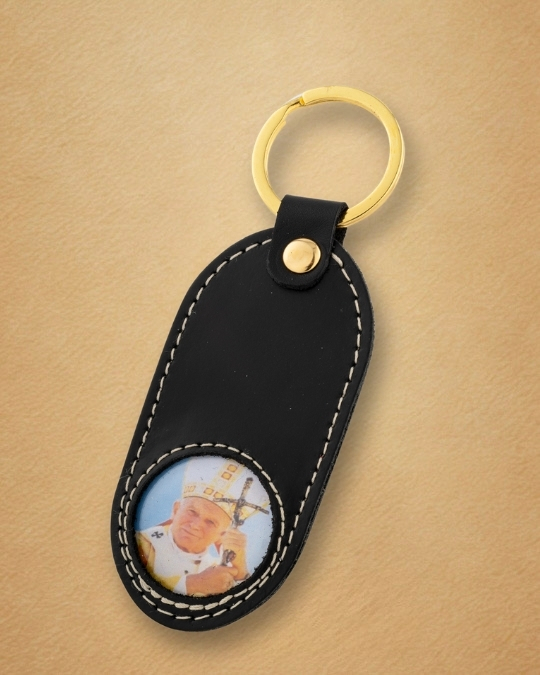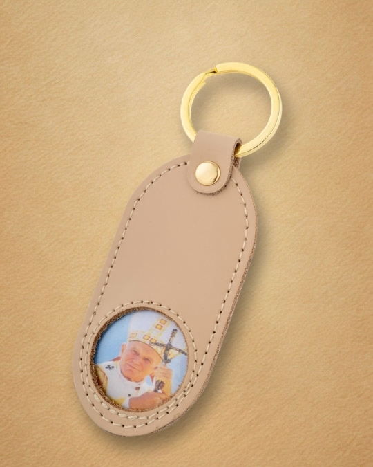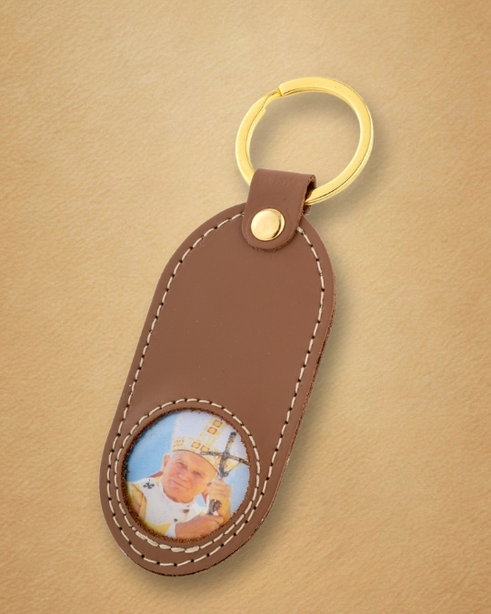 Tłoczony wizerunek Papieża Polaka, wykonany z najwyższą precyzją, sprawia, że brelok staje się osobistą pamiątką – codziennym przypomnieniem o Jego nauczaniu, sile modlitwy i zawierzeniu Maryi.